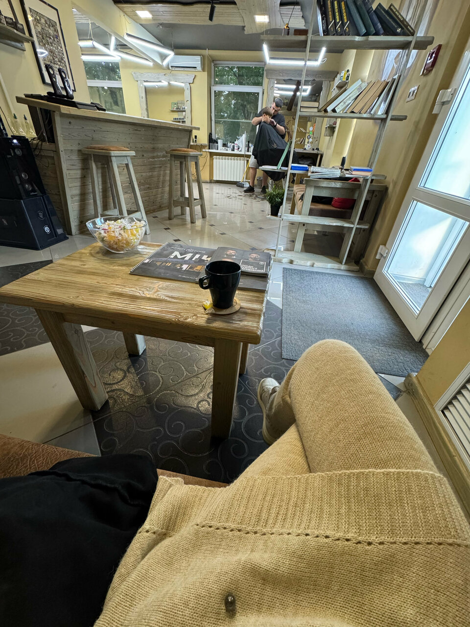Отлично постригли и обработали бороду. Уютно. Чай, кофе, виски: пустяк, но приятно.
